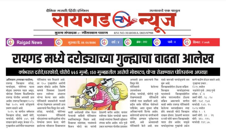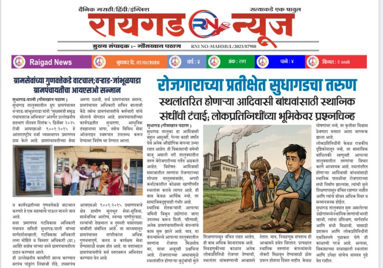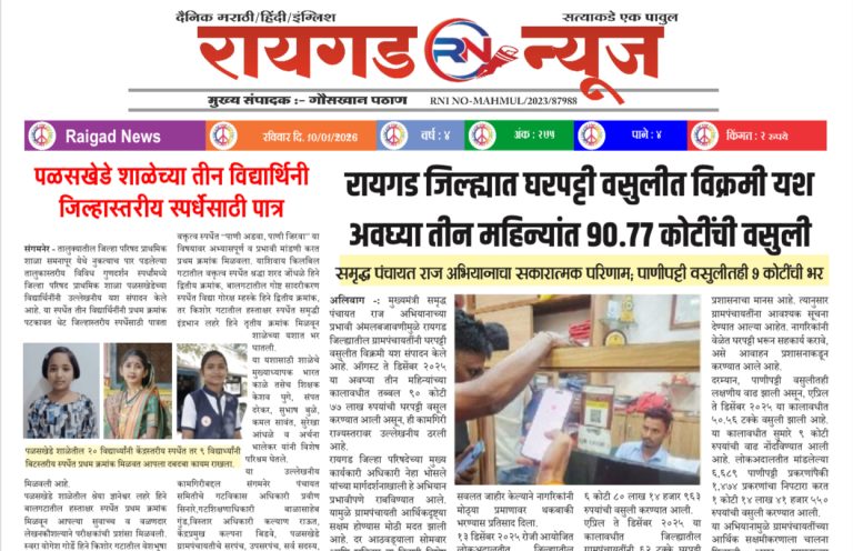 सुधागड-पाली (गौसखान पठाण ) दि. १३ जानेवारी रोजी रायगड जिल्हा परिषदेच्या मुख्य कार्यकारी अधिकारी नेहा भोसले यांनी वर्हाड-जांभूळपाडा ग्रुप ग्रामपंचायतीस भेट देऊन ग्रामविकासाच्या दृष्टीने राबविण्यात येणाऱ्या नाविन्यपूर्ण उपक्रमांची पाहणी केली. या दौऱ्यात त्यांनी ग्रामपंचायतीच्या कामकाजाचा आढावा घेतला आणि पुढील वाटचालीसाठी शुभेच्छा दिल्या. या भेटीदरम्यान उपमुख्य कार्यकारी अधिकारी (ग्रा.प.) विशाल तनपुरे, गट विकास अधिकारी लता मोहिते,…